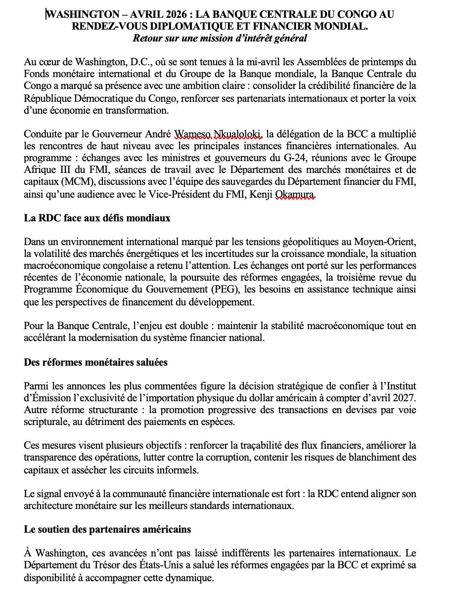 La participation de la Banque Centrale du Congo aux Assemblées de printemps du Fonds monétaire international et du Groupe de la Banque mondiale à Washington, D.C. illustre la volonté des autorités congolaises de renforcer la crédibilité financière du pays. À travers une série de rencontres stratégiques et l’annonce de réformes majeures, la RDC affirme son ambition de moderniser son système financier et de s’aligner sur les standards internationaux.