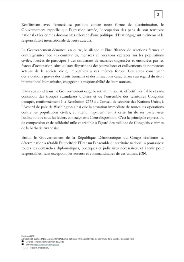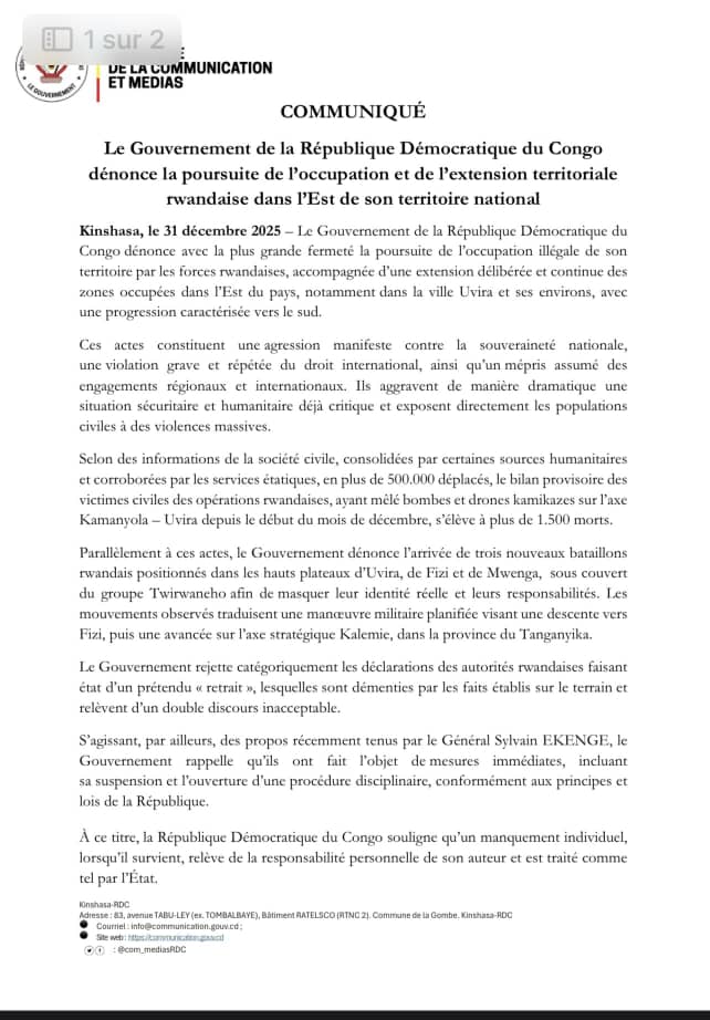 Dans un communiqué officiel, Kinshasa évoque une extension des territoires occupés, notamment autour de la ville d’Uvira, avec une progression vers le sud.
