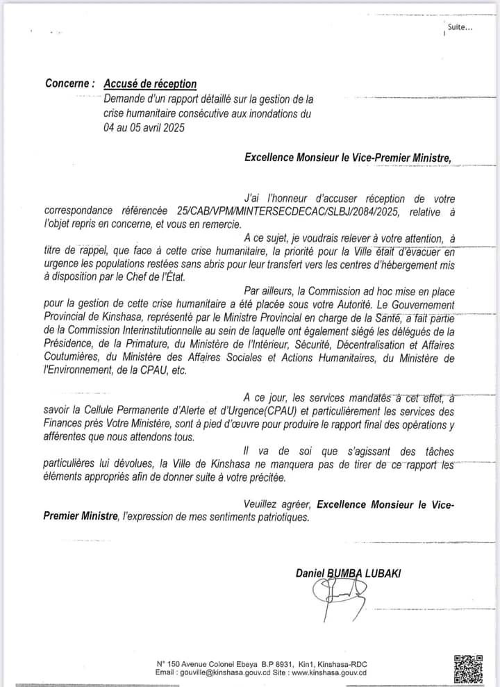 Dans une correspondance adressée au vice-premier ministre de l’Intérieur, Jacquemain Shabani, il rappelle que « la crise humanitaire avait été placée sous l’autorité directe du VPM de l’Intérieur » et que la Ville de Kinshasa n’a joué aucun rôle dans l’utilisation des ressources allouées.