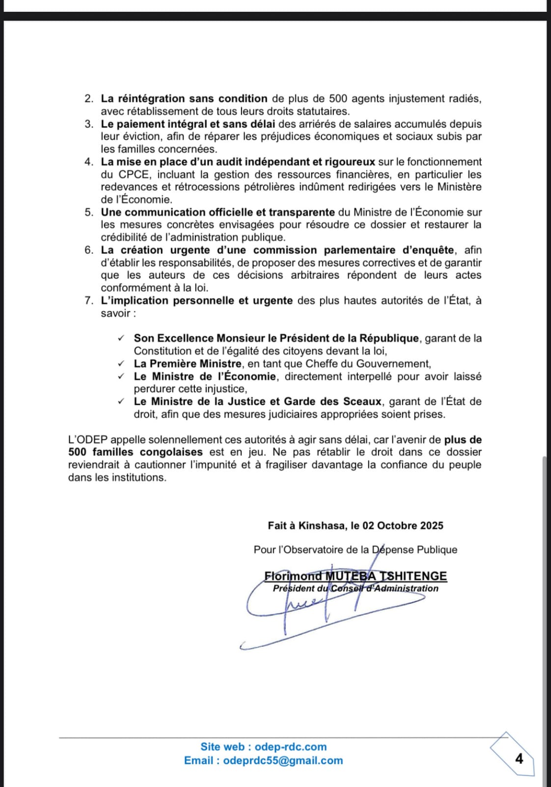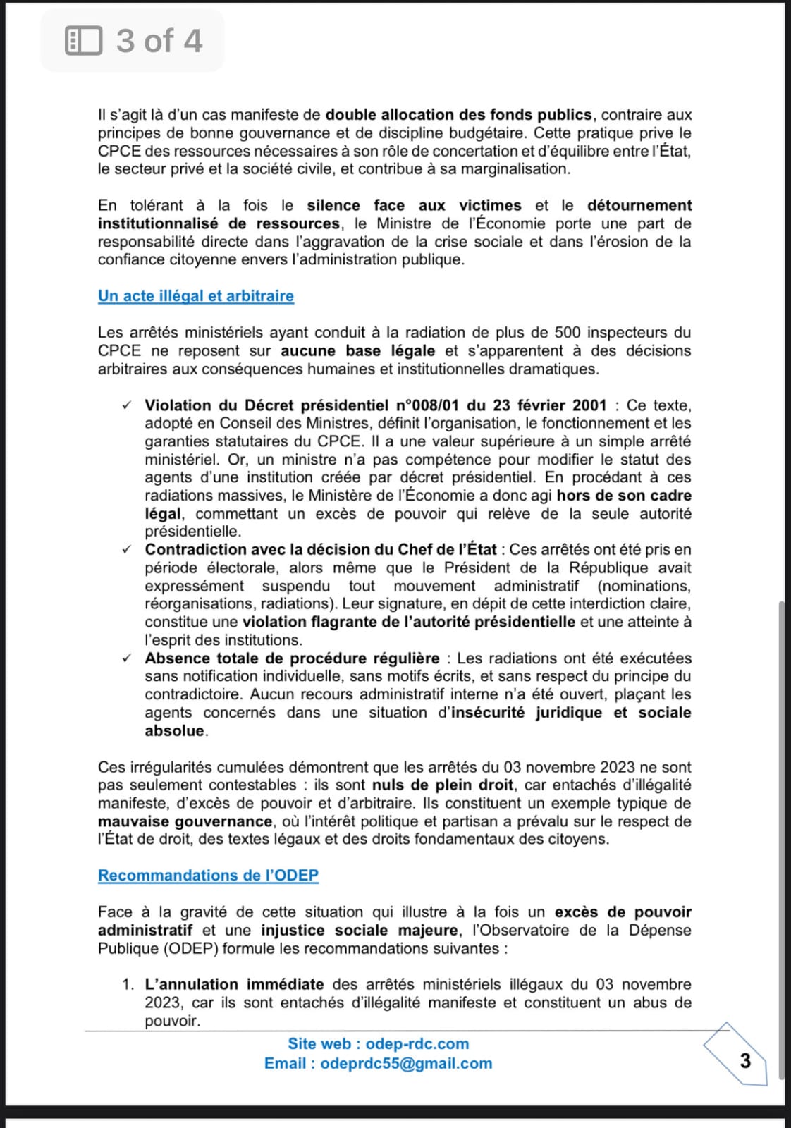 L’Observatoire de la Dépense Publique (ODEP) tire la sonnette d’alarme sur la radiation brutale de plus de 500 agents du Cadre Permanent de Concertation Économique (CPCE), opérée en novembre 2023 par une série d’arrêtés ministériels signés sous le mandat de Vital Kamerhe, Vice-Premier Ministre et Ministre de l’Économie.