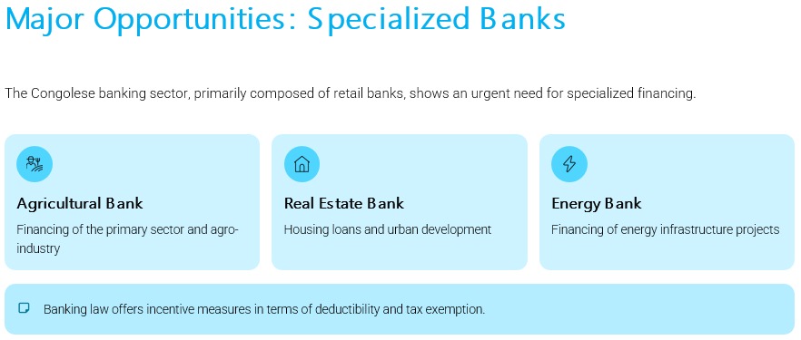 A ce jour, le secteur financier congolais comprend 357 institutions supervisées par la BCC, dominées par 15 banques commerciales qui détiennent 92,4 % du total des actifs. L'activité bancaire a quadruplé en 10 ans, passant de 4,8 milliards de dollars américains à 20,7 milliards de dollars américains.