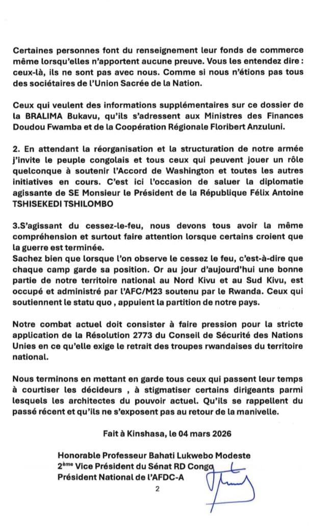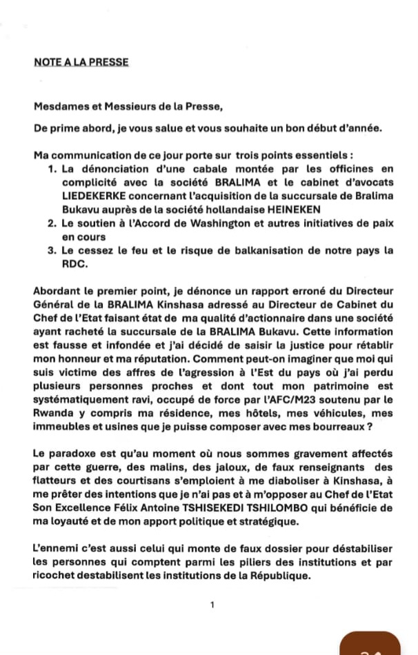 Lors d'une conférence de presse tenue ce mercredi 4 mars, Bahati Lukwebo a abordé plusieurs questions majeures. Il a notamment dénoncé ce qu’il qualifie de cabale orchestrée par des officines, en complicité avec la société BRALIMA et le cabinet d’avocats Liedekerke, autour du dossier relatif à l’acquisition de la succursale de Bukavu auprès du groupe Heineken. Le leader politique a par ailleurs exprimé son soutien à l’Accord de Washington ainsi qu’aux différentes initiatives de paix en cours, avant d’insister sur l’urgence d’un cessez-le-feu et de mettre en garde contre tout risque de balkanisation de la République démocratique du Congo.