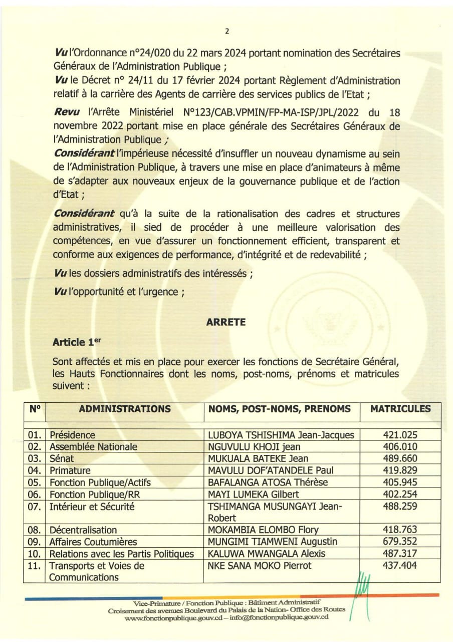 Par ailleurs, au ministère de la Fonction publique, Thérèse Bafalanga Atosa est affectée aux services des Actifs, et Gilbert Mayi Lumeka aux services de la Réserve rémunérée. Au ministère de l’Intérieur et Sécurité, Jean-Robert Tshimanga Musungayi prend la tête des services administratifs, tandis qu’à la Décentralisation, Flory Mokambia Elombo est nommé. Dans les Affaires coutumières, Augustin Mungimi Tiamweni et Alexis Kaluwa Mwangala assurent les nouvelles fonctions, et Pierrot Nke Sana Moko prend la direction des Relations avec les partis politiques.