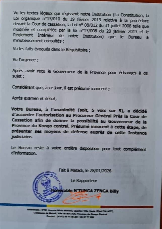 Le communiqué entérinant cette décision a été signé à Matadi, ce 28 janvier 2026, par le rapporteur du Bureau de l’Assemblée provinciale du Kongo Central.