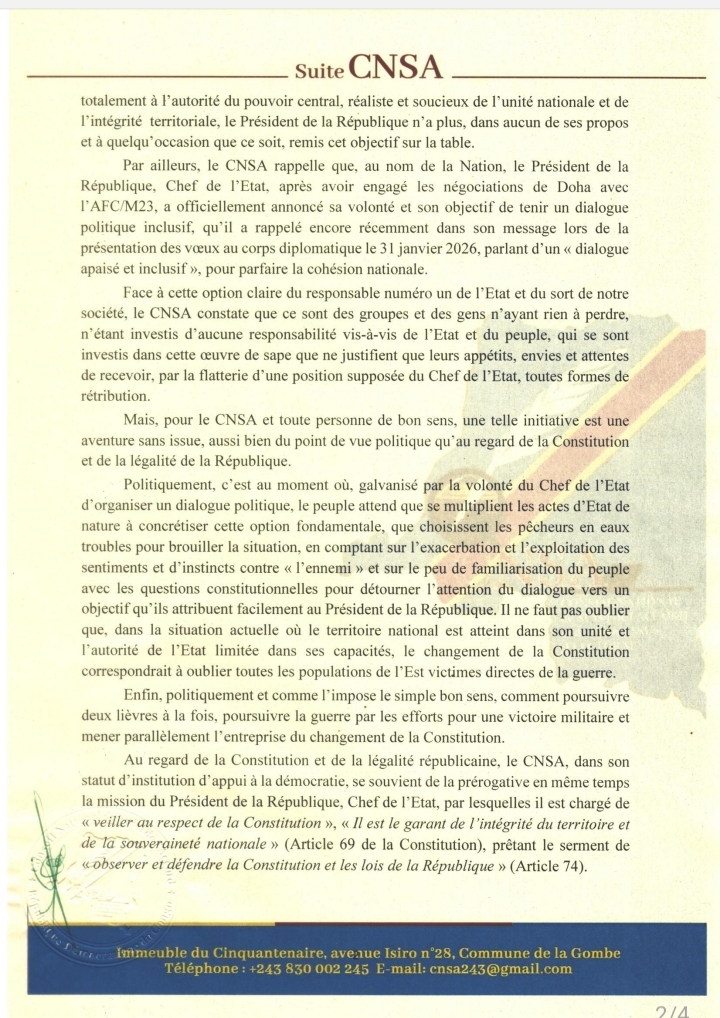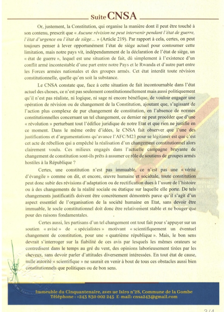 RDC : le CNSA juge inopportune toute révision de la Constitution