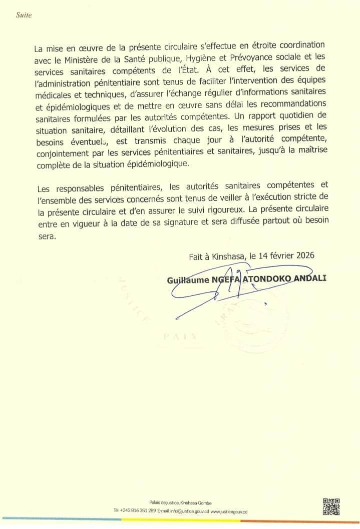 La propagation du choléra à la Prison centrale de Makala a conduit les autorités congolaises à décréter des mesures d’urgence. Dans une circulaire datée du 14 février 2026, le ministre d’État en charge de la Justice, Guillaume Ngefa Atondoko Andali, annonce la suspension immédiate de toute nouvelle admission au sein de l’établissement pénitentiaire.