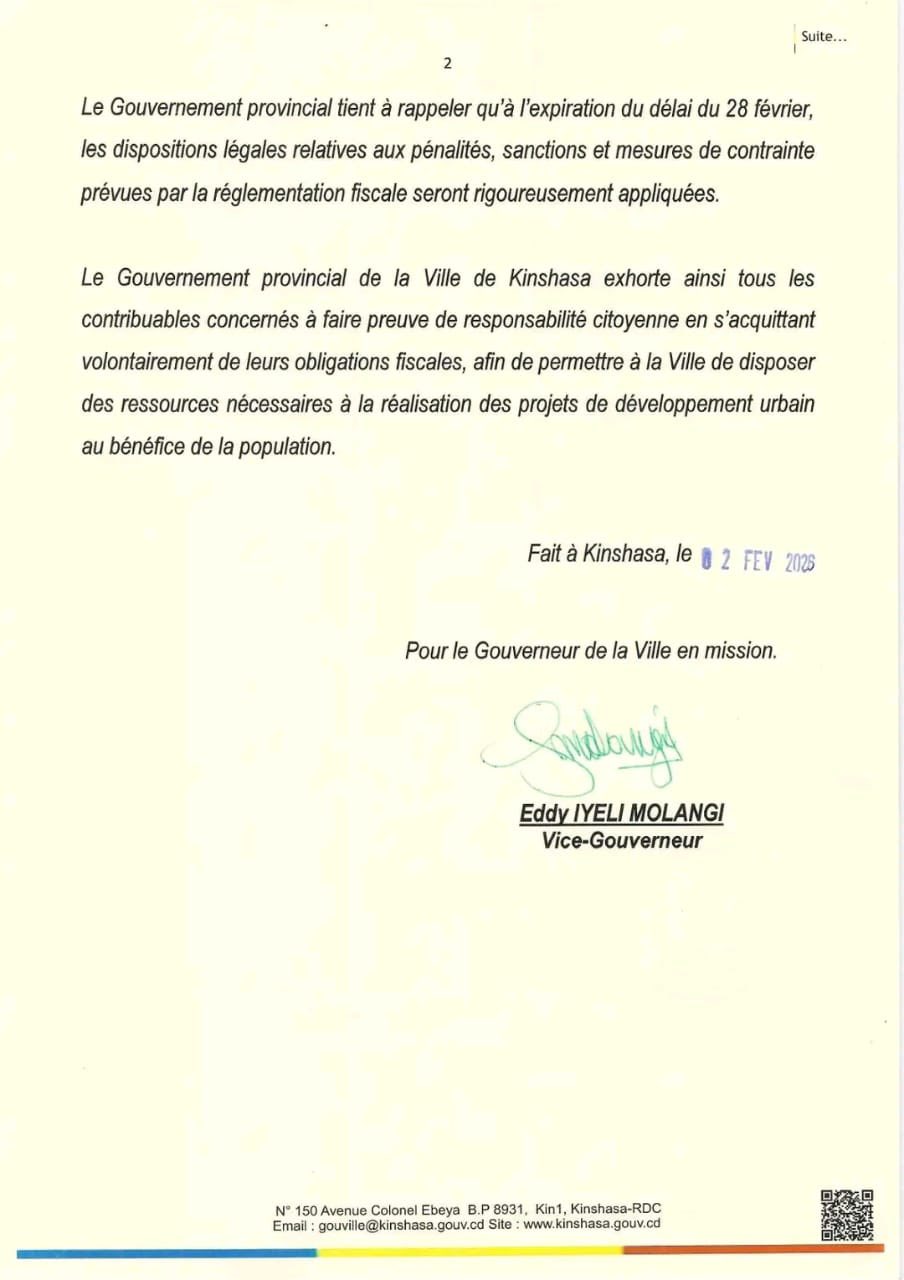S’exprimant au nom de l’Exécutif provincial, le Vice-gouverneur Eddy Iyeli Molangi a invité les contribuables à mettre à profit ce délai supplémentaire pour régulariser leur situation fiscale et ainsi contribuer au développement de la ville de Kinshasa.