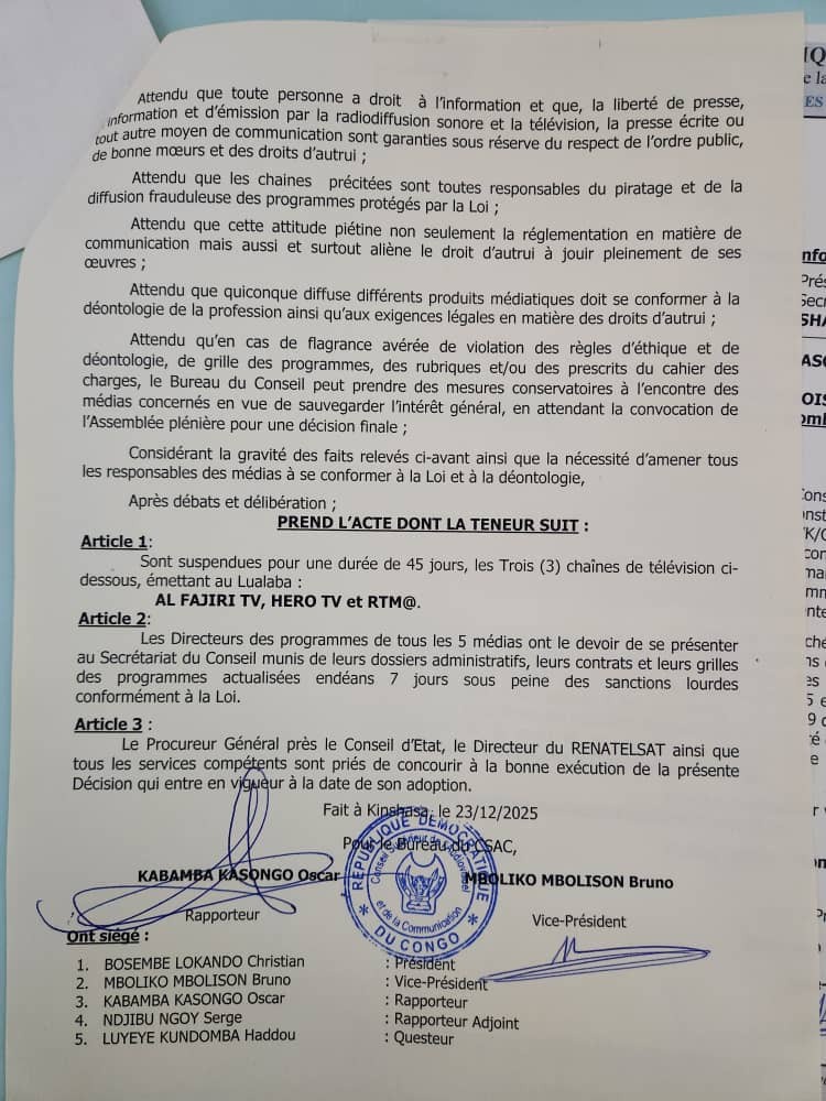 Le Conseil supérieur de l’audiovisuel et de la communication (CSAC) a pris une décision ferme ce mardi 24 décembre 2025 en suspendant pour une durée de 45 jours plusieurs chaînes de télévision à travers le pays, reconnues coupables de piratage de signaux et de diffusion illégale de contenus protégés par la loi. La décision consulté par le pouvoir du peuple, pointe notamment la retransmission non autorisée des matchs de la Coupe d’Afrique des Nations (CAN), au mépris des droits de diffusion détenus par des opérateurs agréés.