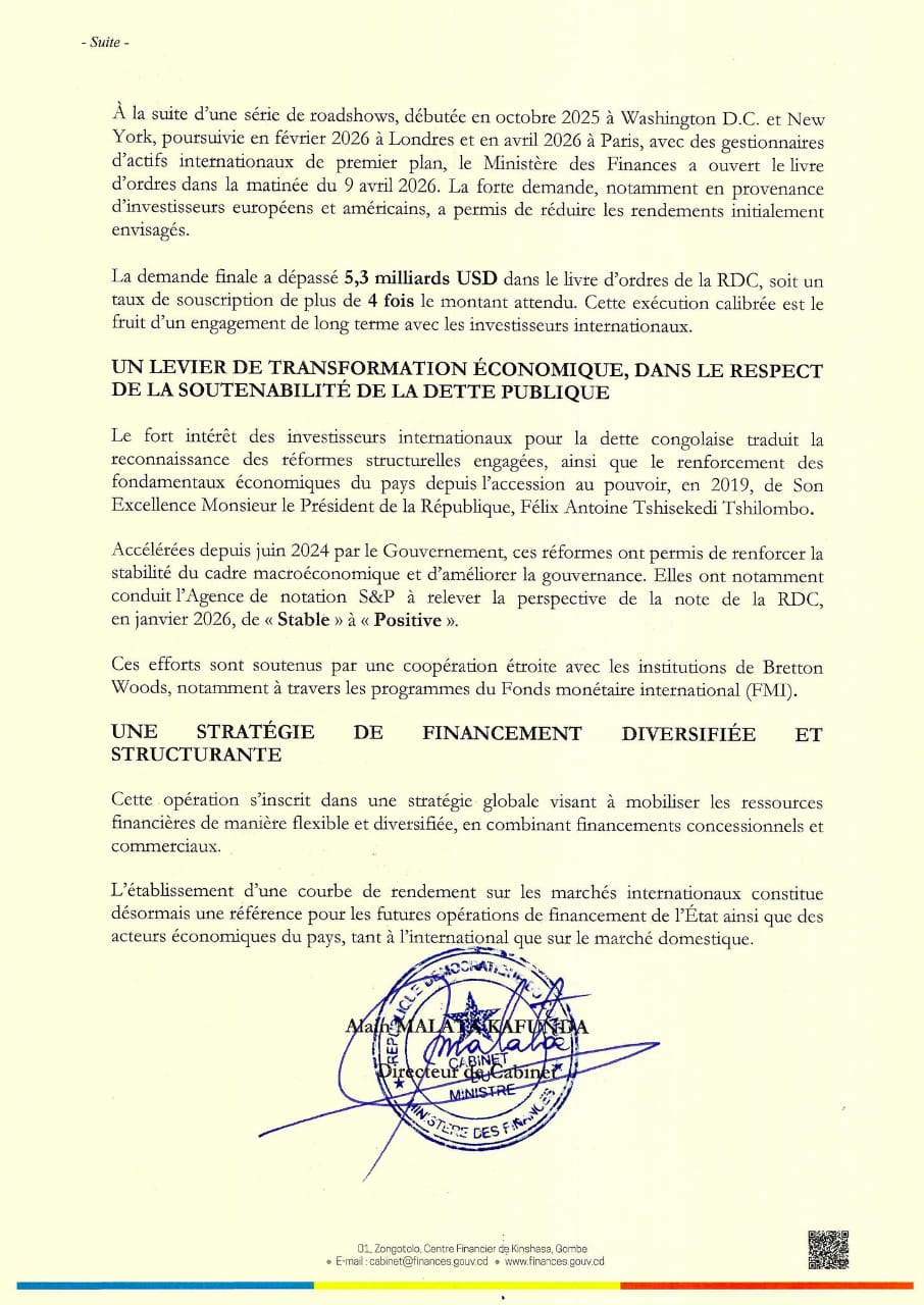 La République démocratique du Congo a réussi, le 9 avril 2026, sa première émission obligataire sur les marchés internationaux, mobilisant 1,25 milliard de dollars en eurobonds.