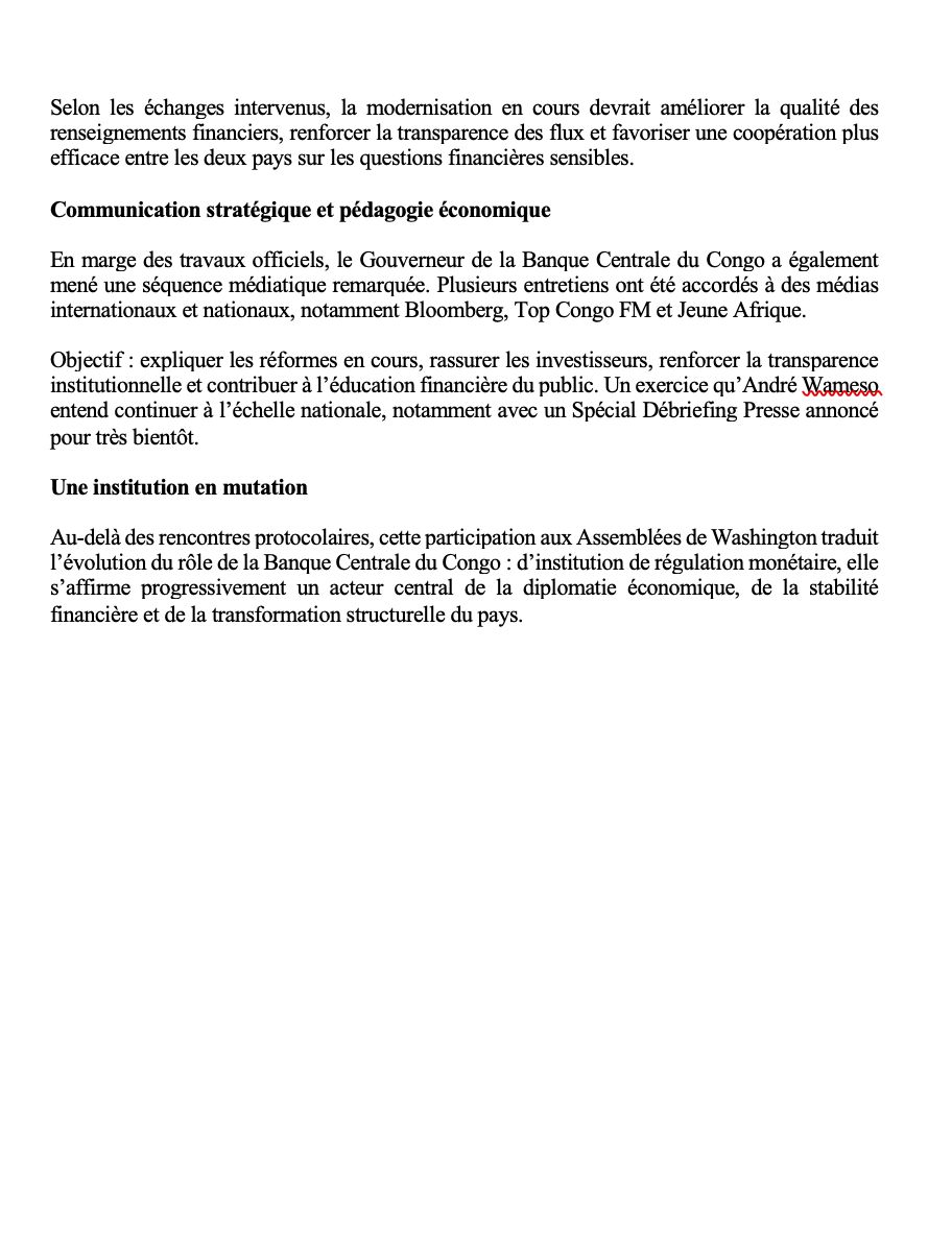 La participation de la Banque Centrale du Congo aux Assemblées de printemps du Fonds monétaire international et du Groupe de la Banque mondiale à Washington, D.C. illustre la volonté des autorités congolaises de renforcer la crédibilité financière du pays. À travers une série de rencontres stratégiques et l’annonce de réformes majeures, la RDC affirme son ambition de moderniser son système financier et de s’aligner sur les standards internationaux.