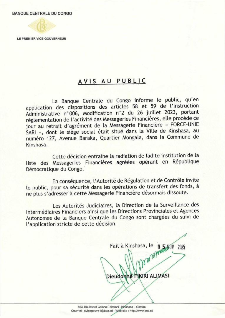 RDC : La Banque Centrale retire l’agrément de la Messagerie Financière FORCE-UNIE SARL