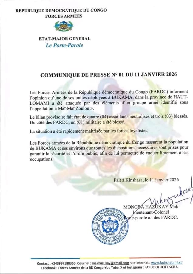 Les Forces armées de la République démocratique du Congo (FARDC) ont annoncé avoir déjoué, le samedi 9 janvier 2026, une attaque menée contre l’une de leurs positions à Bukama, dans la province du Haut-Lomami. L’assaut a été attribué à des éléments du groupe armé Maï-Maï Zoulou.