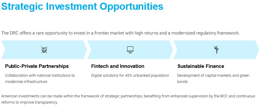 Par ailleurs, André WAMESO s’est fait le porte-voix de la RDC en mentionnant que le secteur bancaire congolais, principalement composé de banques de détail, présente un besoin urgent de financement spécialisé, notamment dans les secteurs de l’agriculture, de l’habitat et de l’énergie. Les investisseurs devraient se réjouir de ce que *les dispositions fiscales prévoient* des mesures incitatives en matière de déductibilité et d'exonération fiscale. A ces opportunités, le Gouverneur de la BCC a également ajouté la latitude de nouer des partenariats publics privés, le développement des produits Fintech et innovants et la finance verte.