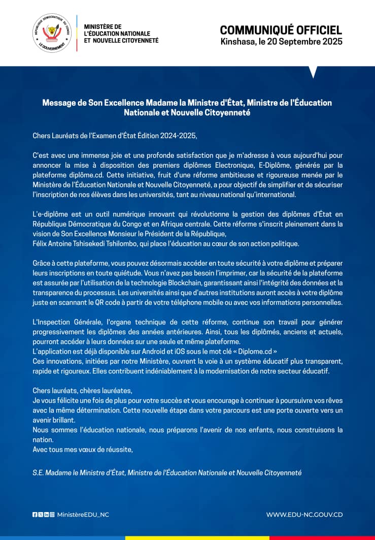 Selon le communiqué signé par la Ministre d’État, cette innovation s’inscrit dans le cadre d’une réforme ambitieuse visant à moderniser et sécuriser la gestion des diplômes d’État en République Démocratique du Congo.