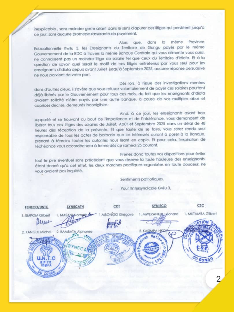 Face à cette situation jugée inacceptable, les représentants syndicaux issus de la FENECO/UNTC, SYNECATH, CDT, SYNIECO et CSCEMP ont lancé un ultimatum de 48 heures à la direction d’Afriland First Bank/Idiofa pour apurer tous les arriérés. Passé ce délai, préviennent-ils, la banque sera tenue seule responsable des “ actes de colère et de débordement ” que pourrait provoquer une base enseignante exaspérée.