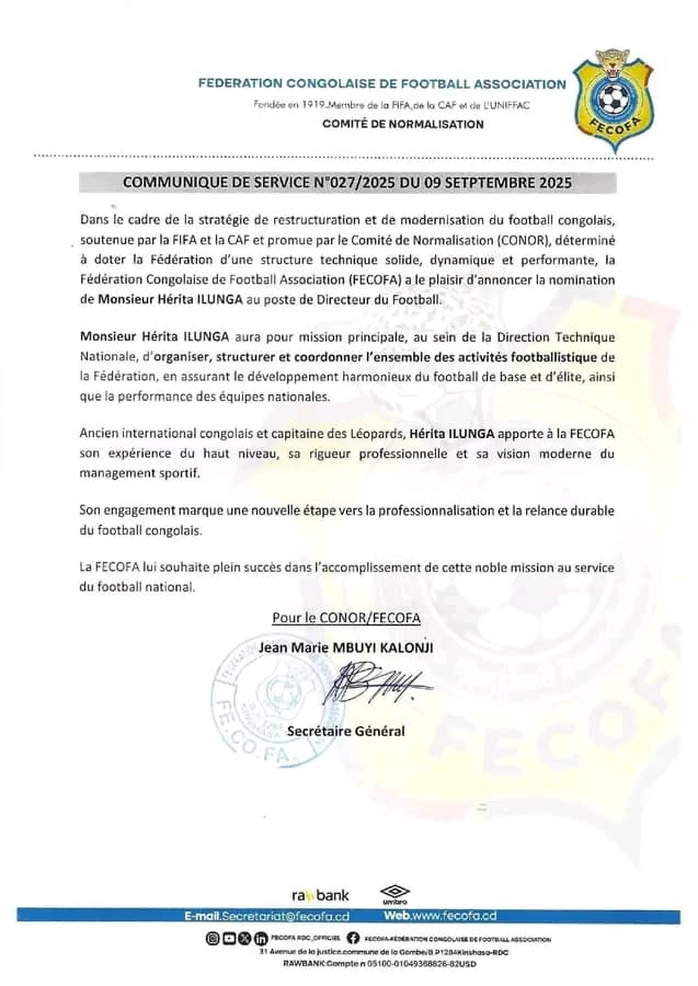 La fédération congolaise de football association FECOFA a via un communiqué publié ce samedi 11 octobre 2025, annonce la nomination au poste de directeur technique national avec comme charge la restructuration du football congolais, monsieur ILUNGA Hérita.