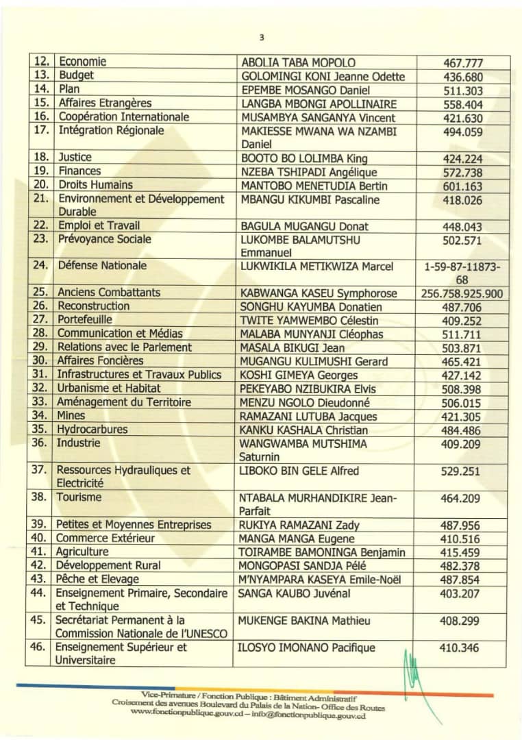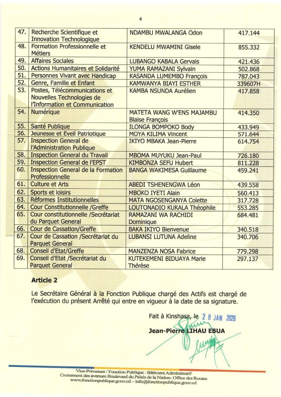 Par ailleurs, au ministère de la Fonction publique, Thérèse Bafalanga Atosa est affectée aux services des Actifs, et Gilbert Mayi Lumeka aux services de la Réserve rémunérée. Au ministère de l’Intérieur et Sécurité, Jean-Robert Tshimanga Musungayi prend la tête des services administratifs, tandis qu’à la Décentralisation, Flory Mokambia Elombo est nommé. Dans les Affaires coutumières, Augustin Mungimi Tiamweni et Alexis Kaluwa Mwangala assurent les nouvelles fonctions, et Pierrot Nke Sana Moko prend la direction des Relations avec les partis politiques.
