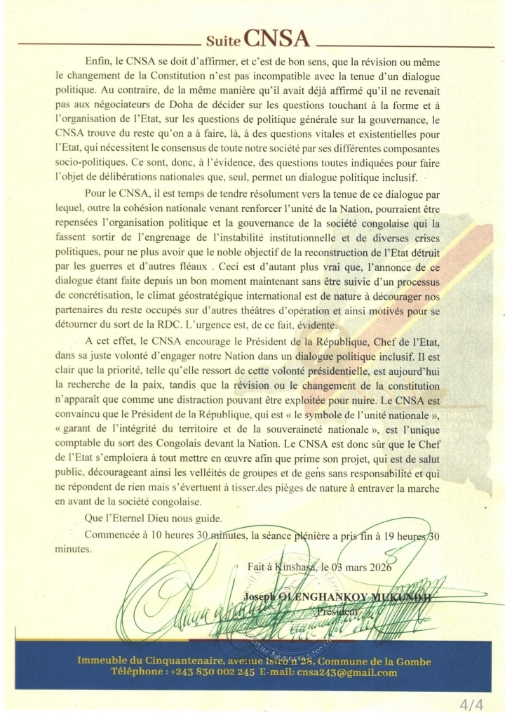 RDC : le CNSA juge inopportune toute révision de la Constitution