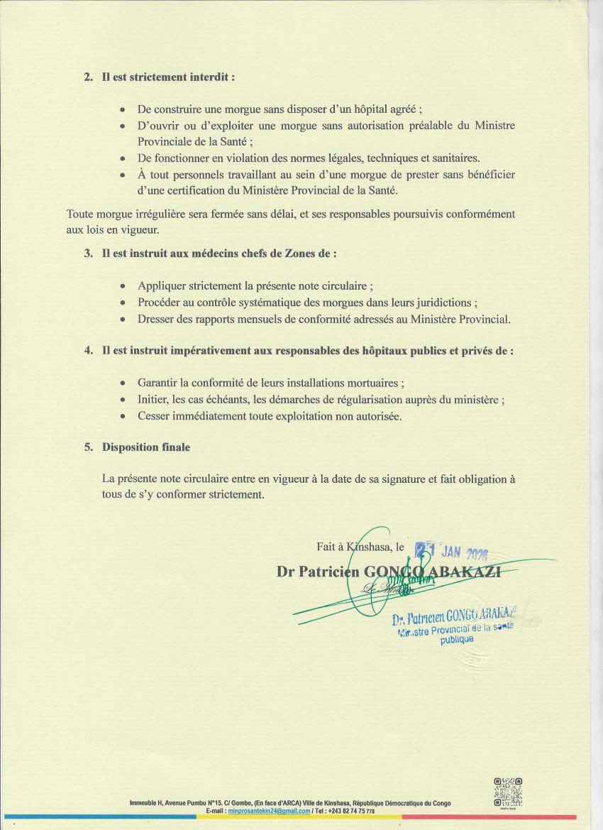 Selon l’autorité provinciale, cette décision s’inscrit dans une démarche de rétablissement de l’ordre sanitaire et de protection de la santé publique. Désormais, la construction d’une morgue sans être adossée à un hôpital dûment agréé est formellement interdite. Il est également prohibé d’ouvrir ou d’exploiter une morgue sans autorisation préalable du ministre provincial de la Santé.