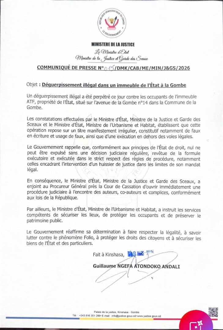 Le ministre de la Justice a dénoncé, ce jeudi, un déguerpissement illégal intervenu dans un immeuble appartenant à l’État, situé sur l’avenue de la Gombe n°14, dans la commune de la Gombe, au nord de la capitale.