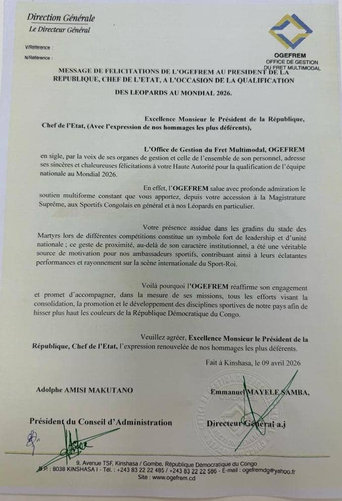 Message de félicitations de l'Ogefrem au Président de la République à la suite de la qualification des Léopards au Mondial 2026