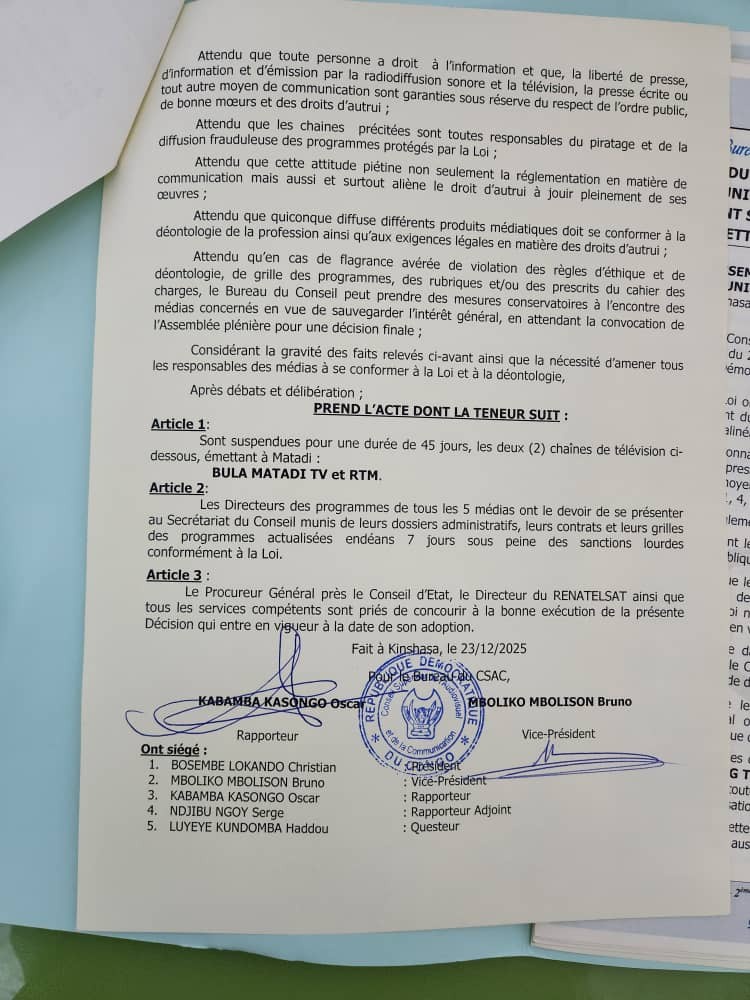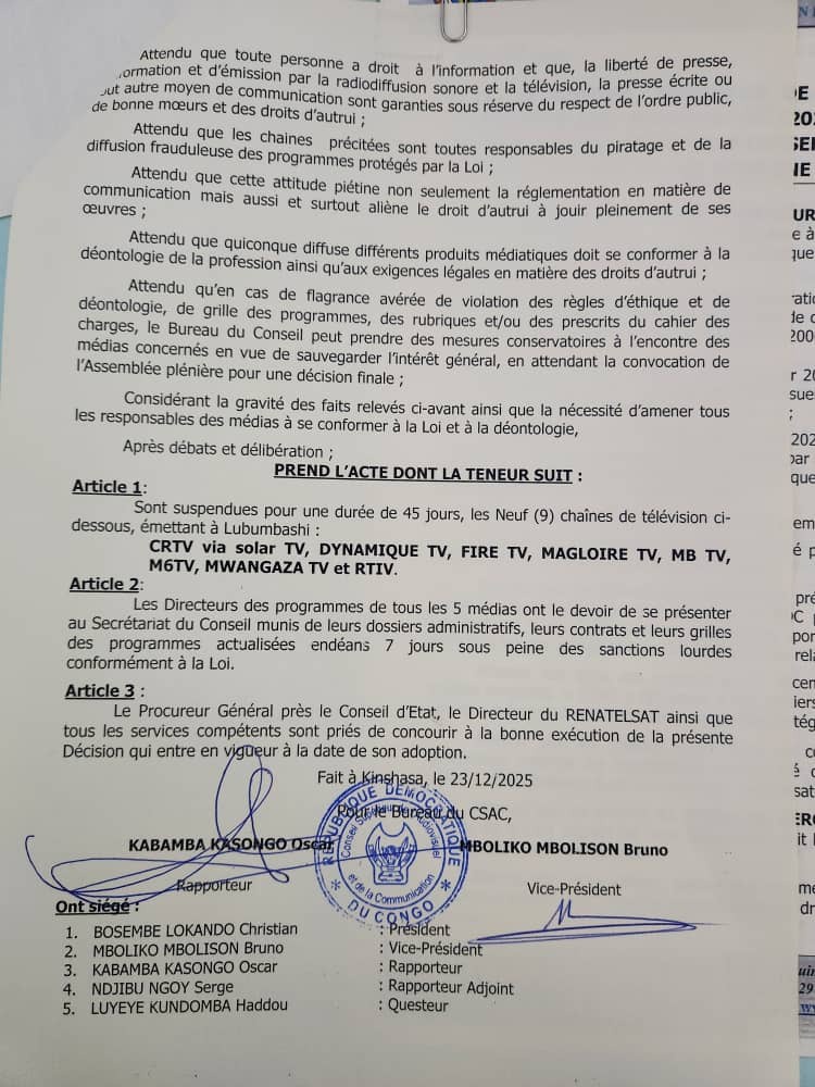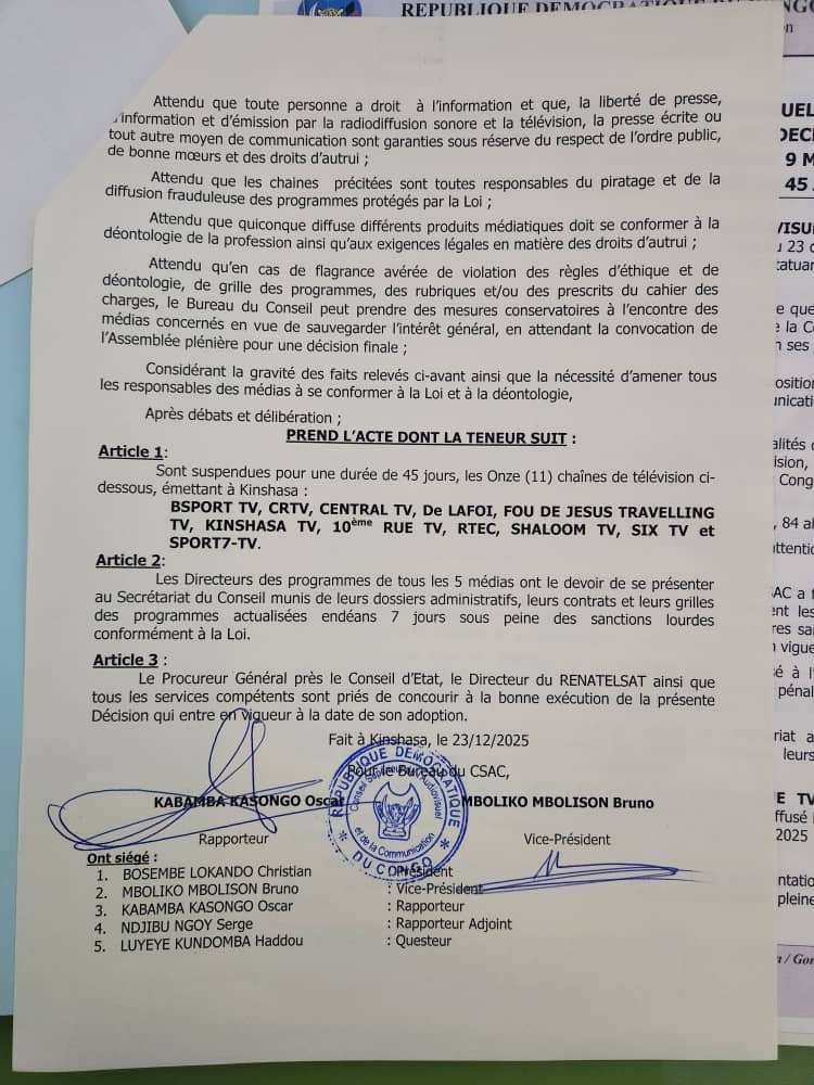 Le Conseil supérieur de l’audiovisuel et de la communication (CSAC) a pris une décision ferme ce mardi 24 décembre 2025 en suspendant pour une durée de 45 jours plusieurs chaînes de télévision à travers le pays, reconnues coupables de piratage de signaux et de diffusion illégale de contenus protégés par la loi. La décision consulté par le pouvoir du peuple, pointe notamment la retransmission non autorisée des matchs de la Coupe d’Afrique des Nations (CAN), au mépris des droits de diffusion détenus par des opérateurs agréés.